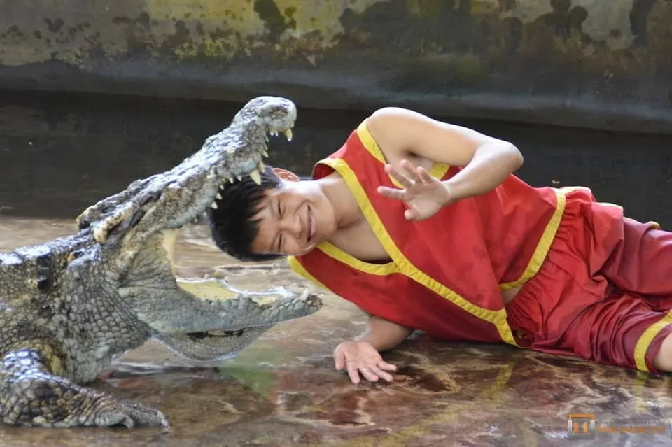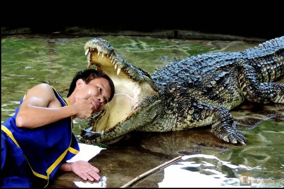 At crocodile show time guests are ushered through to an undercover area with a fenced enclosure containing 4 primitive beasts varying in size and age. The two hosts, join the animals and talk guests through some crocodile facts while carefully manoeuvring the reptiles onto a concrete slab. Here they do some dangerous and very entertaining stunts with the crocodiles, including sticking their heads between the powerful jaws of the creature. For those that might think these animals are highly trained and the risk is minimal, have a chat with Hin after the show. He has many visible scars and actually lost a thumb. The crocodile show runs for about 45 minutes.